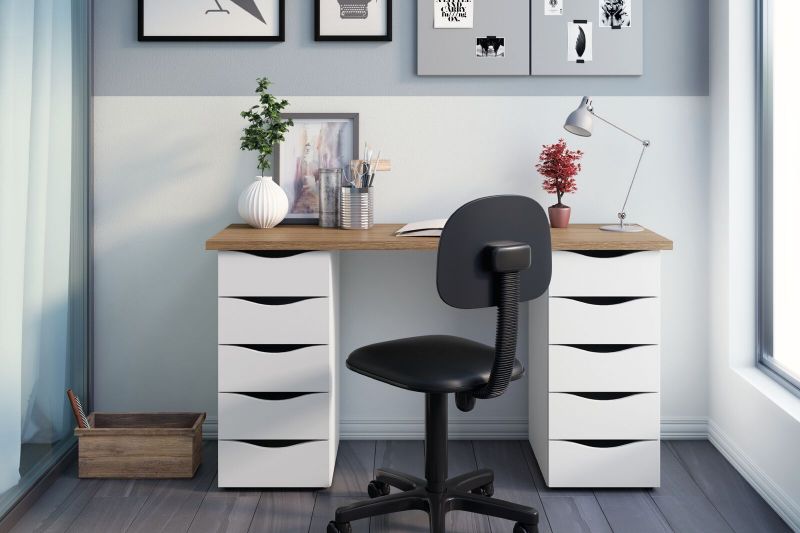 - Dê preferência para mesas compactas, mas observe a quantidade de gavetas e repartições que ela possui, pois isso vai otimizar o espaço do seu escritório.